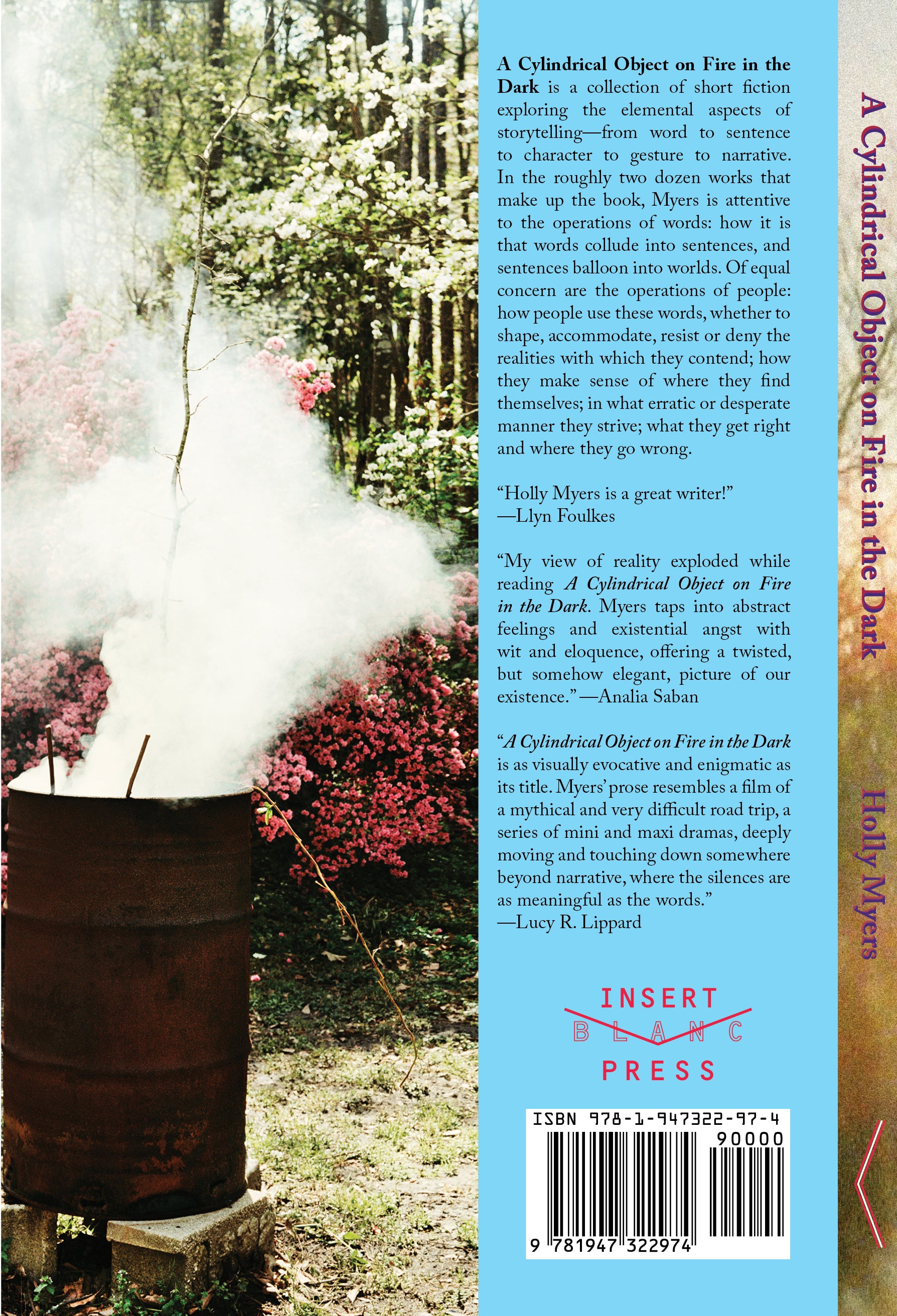 "I still remember first reading Holly Myers’ art writing, it was infused with such rich and visceral description, such resonant conceptual observation. In A Cylindrical Object on Fire in the Dark, her introspection and invention of new structures gives voice to an honesty far out of reach to most of us. These short pieces grab and awaken us to the ever present truth of being human, both in relationship to others and to ourselves. They ignite our awareness of the profoundly vivid reality of everyday life. A Cylindrical Object on Fire in the Dark is a brave exploration into what is possible within the short story structure. Myers’ creativity is on full display and the result is a hauntingly honest work of art that illuminates what it means to be truly awake in the everyday." —Uta Barth