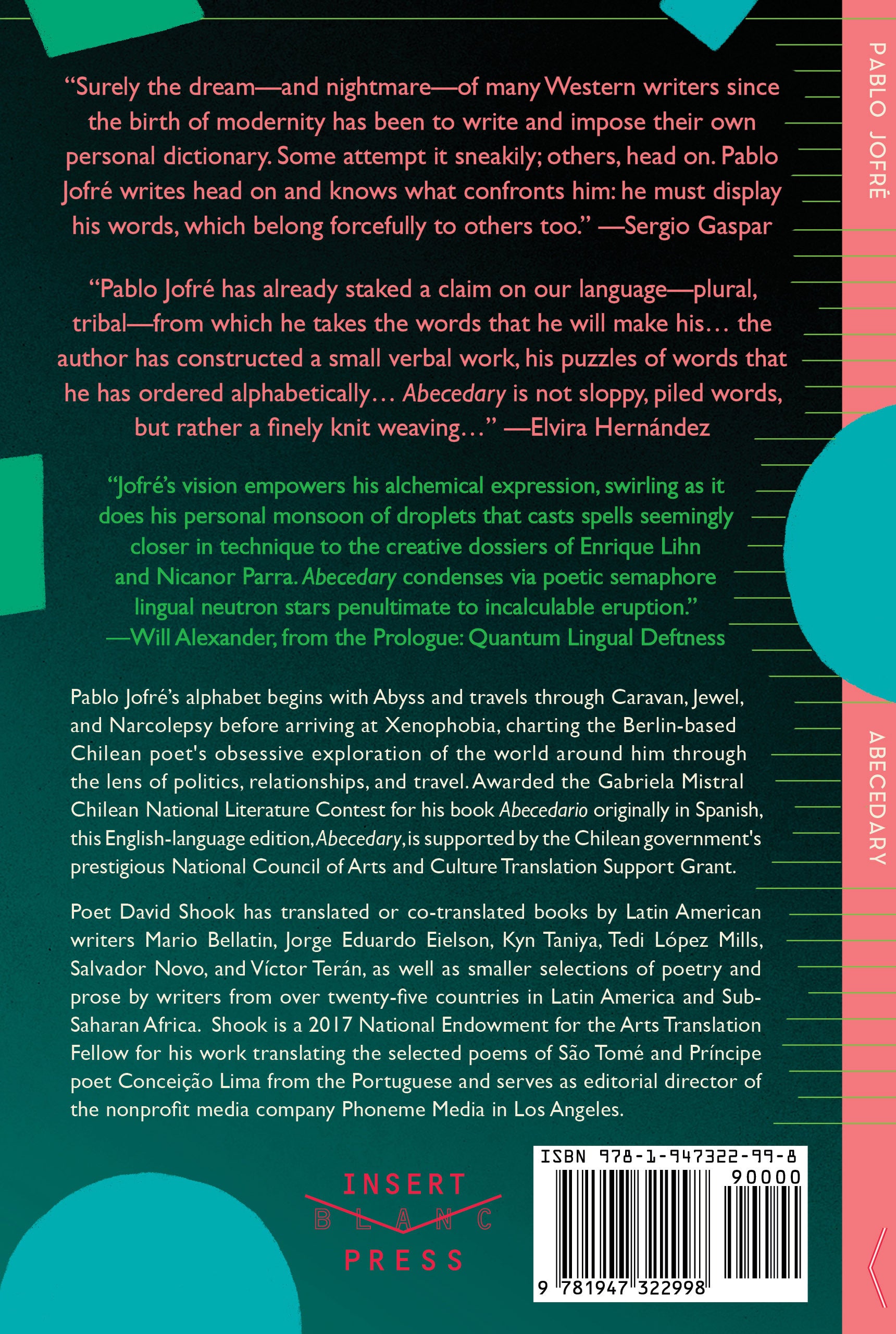 Pablo Jofré’s alphabet begins with "Abyss" and travels through "Caravan," "Jewel," and "Narcolepsy" before arriving at "Xenophobia," charting the Berlin-based Chilean poet's obsessive exploration of the world around him through the lens of politics, relationships, and travel. Awarded the Gabriela Mistral Chilean National Literature Contest in its original Spanish, this bilingual edition, Abecedary, is supported by the Chilean government's prestigious National Council of Arts and Culture Translation Support Grant.