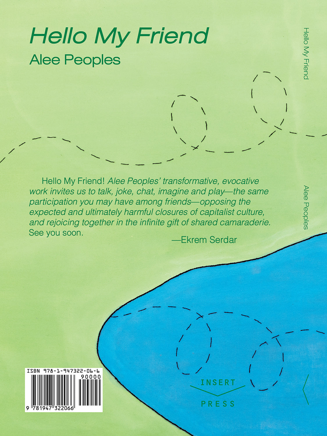 Hello My Friend is an exhibition catalog of Alee Peoples' 2023 show of the same name at Insert Press General Projects including an essay by Ekrem Serdar and full documentation of the show.