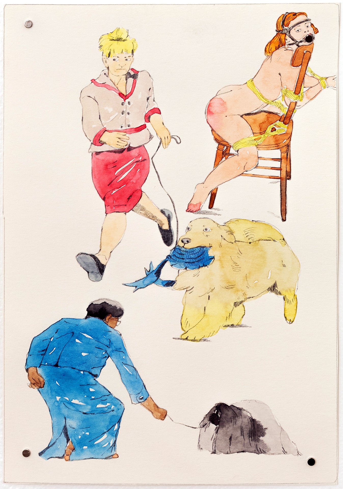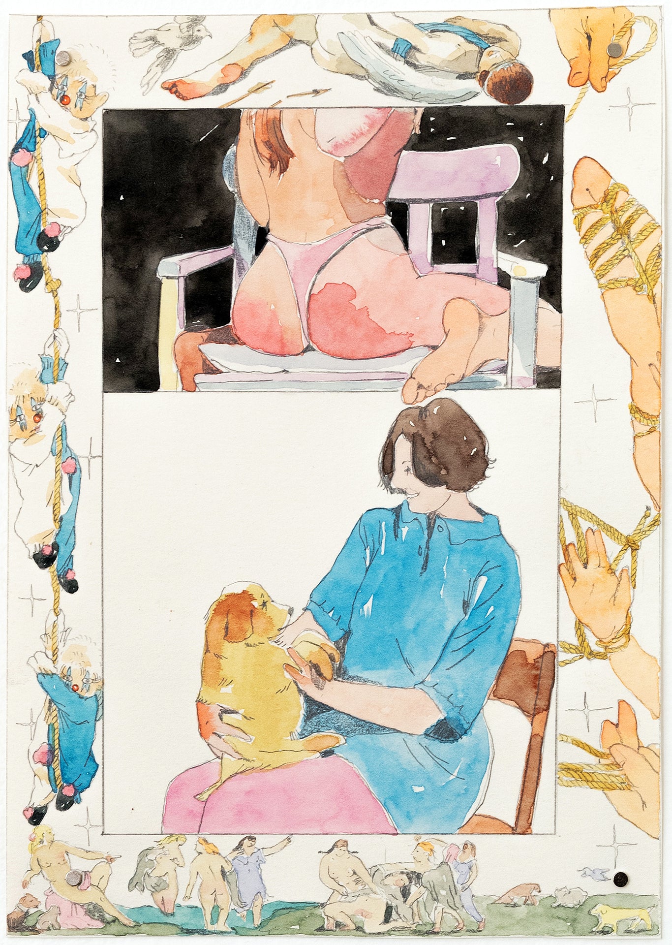 Echikson’s illustrations are featured in Being Work, a forthcoming book from Insert Press, edited by Dorothy Dubrule. A collection of essays by dance and theater artists that describe the labor of performance within visual arts contexts, Being Work captures a spectrum of profound and mundane moments while asking how this kind of gig work is perceived and valued. Echikson’s eight illustrations for the book can be viewed alongside additional works by the artist in the exhibition Here Sometimes at General Projects. The closing party for Echikson’s show in early-February 2024 will also be the launch party for Being Work (exact date and details TBD).